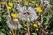 Dew-covered dandelions in vineyard of Hambledon Wine Estate. Hambledon, Hampshir...