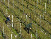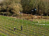 Gwilym Cooper and Leah Holt pruning Pinot Meunier vines in Hide vineyard of Blac...