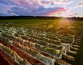 Bird netting on vineyard of Domaine Le Clos Jordanne at sunset. Beamsville, Onta...