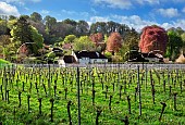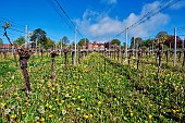 Spring dandelions amidst Chardonnay vines in Home Vineyard, below Mill Down Hous...