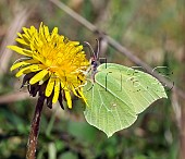 Brimstone male nectaring on dandelion flower. Harewood Common, Andover, Hampshir...