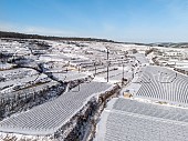 Snow on the terraced Heiligenstein vineyard. Niederösterreich, Austria. [Kampta...