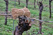 Bundle of vine ties on pruned vine in Levels vineyard of Black Chalk. Fullerton,...