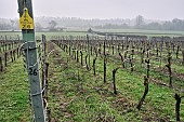 Gwilym Cooper pruning Chardonnay vines on a misty morning in Levels vineyard of ...