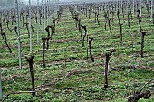 Pruned Pinot Noir vines in Levels vineyard of Black Chalk. Fullerton, Hampshire,...
