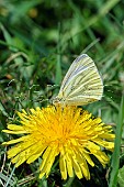 Green-veined White nectaring on a dandelion. Harewood Common, Andover, Hampshire...