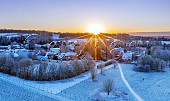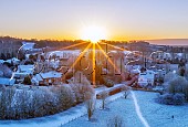 Snowy sunrise at Goodworth Clatford Vineyard with the village and St Peter's Chu...