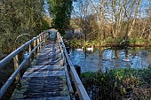 Swans and cygnets by footbridge over the River Test on a frosty morning. Longpar...