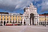 Trams by Arco Triunfal da Rua Augusta on the Praça do Comércio. Lisbon, Portugal...