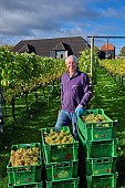 Christopher Cooke with crates of harvested Chardonnay grapes at Winding Wood Vin...