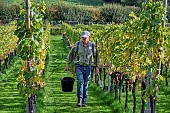 Christopher Cooke in Chardonnay vines on harvest day at Winding Wood Vineyard. O...