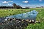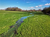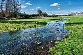 Pillhill Brook chalk stream in February. Fed by aquifers, it is a winterbourne a...