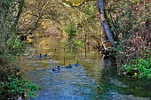 Ducks on Pillhill Brook near Upper Clatford. Andover, Hampshire, England.
