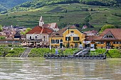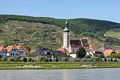 View over the River Danube to the waterfront at Spitz an der Donau with the chur...