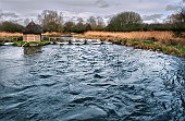 River Test after heavy rain: fishing hut and eel traps at The Bunny, part of the...