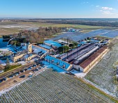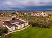 Château Lagrange with its chais and vineyards after snow. Saint-Julien-Beycheve...
