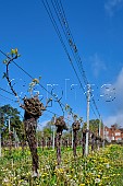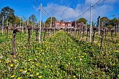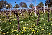 Spring dandelions amidst Chardonnay vines in Home Vineyard, below Mill Down Hous...